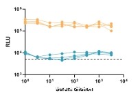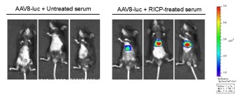 Fig. (left): RICP-treated serum (orange) and untreated mice serum (blue), after incubation with AAV-Luc and infection of 293T cells, showed Luc activity. Gray bar represented that Luc expression of AAV8-Luc-untreated 293T cells. n=4. (right): In vivo bioluminescence imaging of mice injected with AAV-luc pre-incubated with serum from RICP treated or untreated mice.